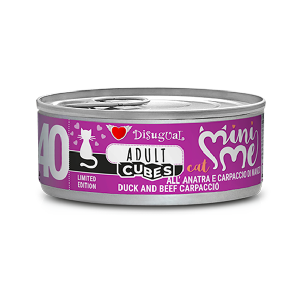 Disugual MiniMe Cubes è l’alimento umido completo formulato appositamente per il tuo gatto con una nuova texture che combina carni macinate e gustosi cubetti!